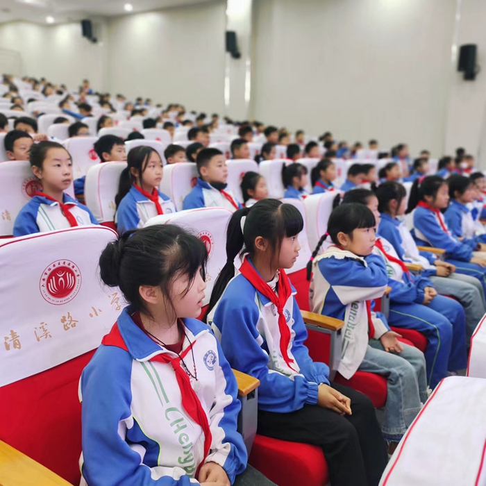 活动伊始,在高昂激荡的队歌中,校少先队大队委成员为各位领导、专家佩戴红领巾,营造了良好的活动氛围。