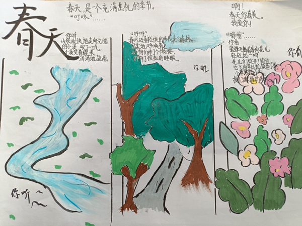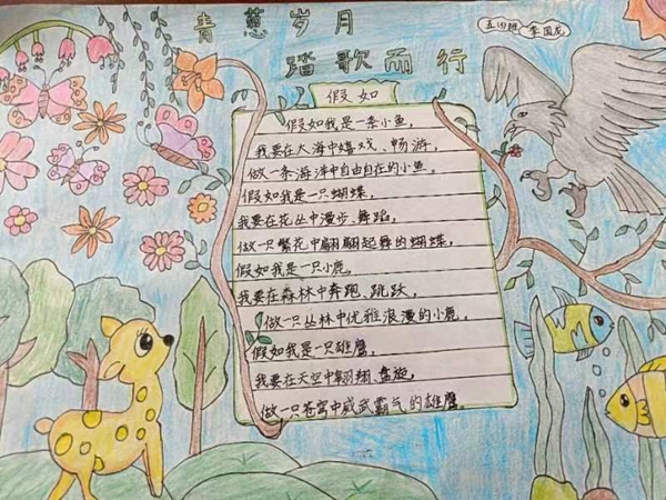 古人云:“诗中有画,画中有诗”。现代新诗也不例外。队员们创新的把自己诗歌内容配上了画面,做到了图文互映,有声有色。赛诗会活动的当天,很多队员都走上讲台,一边现场吟诵自己的作品,一边向其他队员展示自己的诗歌手抄报。这又成为这个青葱岁月里的另外一道风景线。
