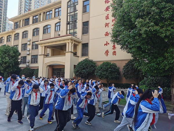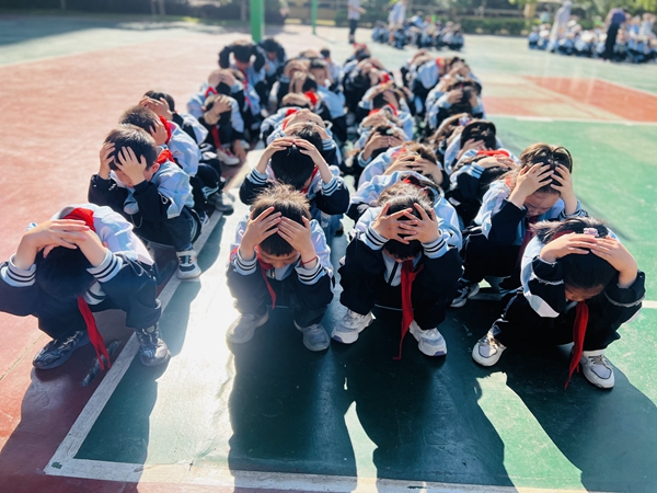 第一次警报铃声响起,地震应急疏散演练正式开始!全校师生立即停止活动,以最快速度躲避到安全区域,迅速抱头、蜷曲身体,降低身体重心,躲在墙角等三角区域,保护头部,并远离窗户。