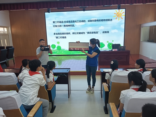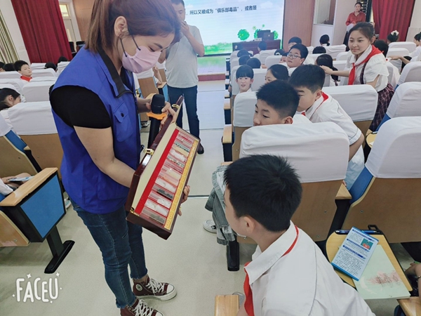 裕安区社区戒毒(康复)服务中心专职禁毒社工周盼为同学们授课。周社工从常见毒品介绍、吸毒对青少年的危害以及青少年如何预防毒品侵害三个方面,用生动的语言讲解、精美的课件展示,并带来了仿真毒品模型,为同学们上了一堂精彩、生动的禁毒宣传课。