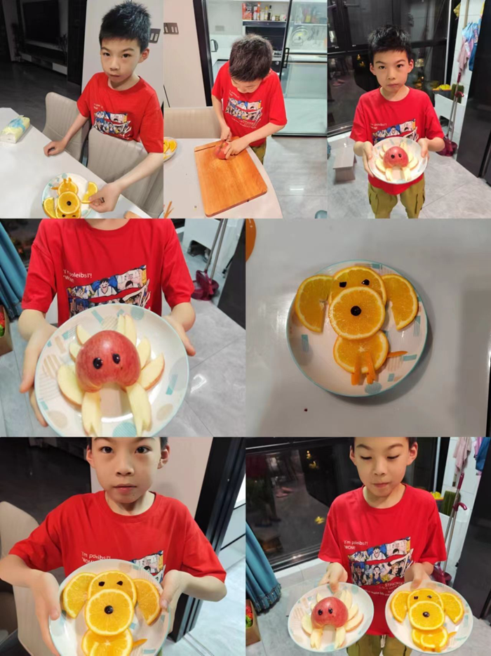 假期还可以进行哪些有趣的劳动呢?这不,五年级喜爱厨艺的队员们便利用假期忙活起来,更新了自己的拿手菜谱:西红柿炒鸡蛋、酸辣包菜、青椒炒豆干……厨房中忙碌的身影,餐桌上诱人的美食,让劳动的滋味分外鲜美。还有的队员利用常见的水果,或剥、或切、或拼摆,通过不同巧思,把各种水果变成精美的图案和造型,果香四溢的美味巧妙地组合在一起,制作各款高颜值的水果拼盘,队员们从中体会到了劳动之美、创意之乐。