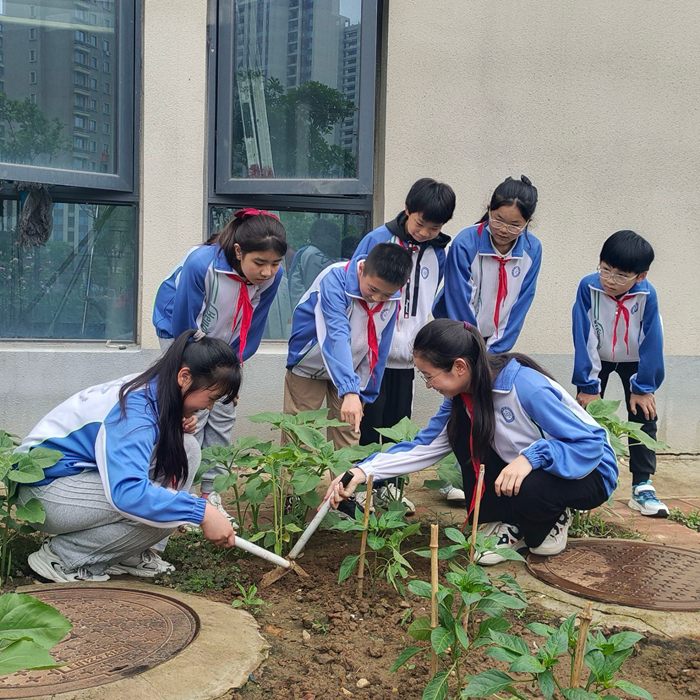 瞧!清溪校园的劳动实践基地里,六年级的队员们正你一铲我一锹,翻土、播种、浇水忙得不亦乐乎呢!老师为队员们讲解了西瓜苗与向日葵苗的培育过程、清除虫害及播种的相关知识,并为队员们示范如何栽种瓜苗。队员们热情高涨,都迫不及待地要为一株株心爱的西瓜幼苗和向日葵苗安家落户。移步至清溪百草园,队员们积极参与到清理园内乱枝杂草的工作中。尽管衣服被泥土弄脏,双手磨得发红,但队员们脸上仍洋溢着甜甜的笑容。在一草一苗间,一耕一种中,劳动的种子深植在了队员们的心田,他们通过亲身实践,感受到大自然的魅力,也体会到劳动的艰辛与快乐。