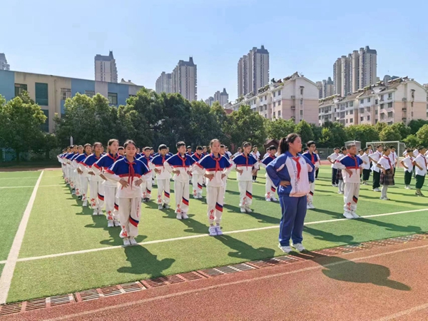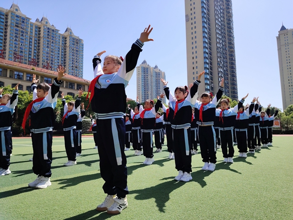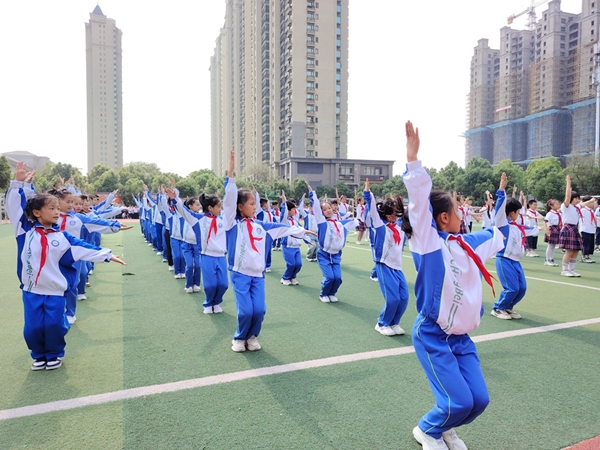 伴随广播体操轻快的节奏,同学们动作标准、有力,展现刚健之美;他们弯腰、转身、踢腿、跳跃整齐划一,洋溢自信神采。
