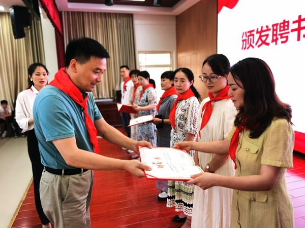 校领导向各新建中队授中队旗,并颁发了聘书和特色中队牌――一面面鲜艳的旗帜,一本本厚重的聘书,一份光荣的使命。