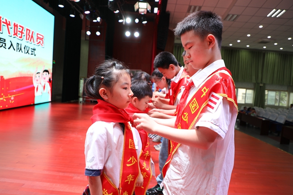 红领巾是红旗的一角,是荣誉的象征。伴随着《红领巾飘起来》的悠扬旋律,六年级的优秀队员代表为一年级新队员佩戴红领巾,新老队员互相敬礼。当鲜艳的红领巾飘扬在胸前,新队员们脸上洋溢着激动与自豪。
