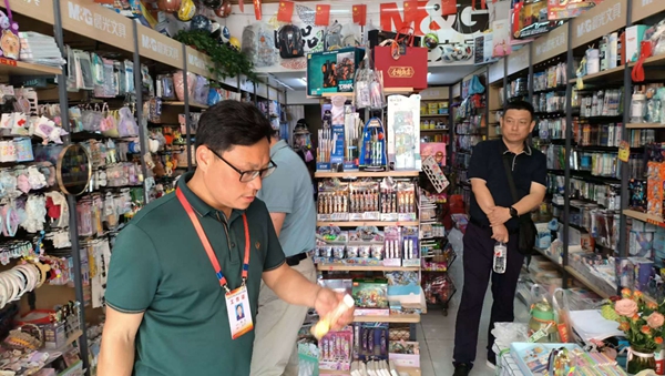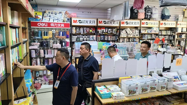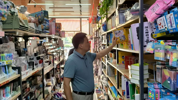 检查组一行深入河西小学周边商店,检查各商店的经营许可证和卫生许可证是否齐全有效,告诫经营者严禁销售“臭屁蛋”、“烟卡”等网红玩具,严禁向学生销售危险、恐怖、迷信等低俗的玩具、文具、饰品和假冒伪劣文化用品,以及使用时存在安全风险或易引发暴力倾向的儿童和学生用品以及类似新产品,如臭屁蛋、烟卡、圆珠笔刀、萝卜刀、泡大珠、激光笔、水晶泥、磁力珠、鼻吸能量棒、火漆印章、儿童真煮厨具等危险玩具。严禁商家引诱学生参与“砸金蛋”、盲盒、抽奖等带有赌博性质侵害学生切身利益的行为,保证学生的学习娱乐用品质量安全、内容健康。