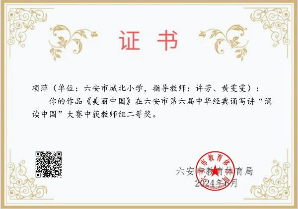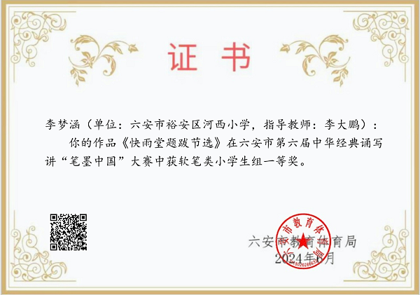 为提升全体师生的语言文字应用能力和语言文化素养,彰显中华语言文化魅力,营造亲近经典、热爱经典的校园氛围,推动经典文化教育教学高质量发展,我校积极组织师生参加六安市教体局举办的“典耀中华 赓续文脉”为主题的“笔墨中国”汉字书写大赛、“诵读中国”经典诵读大赛两项比赛。