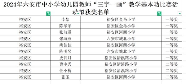 本次比赛是我校继2023年六安市“三字一画”比赛4人均获一等奖后,再创新高,充分展示了四校区教师的专业素养和教学基本功水平。今后,学校将进一步在教师间营造勤学苦练、争先创优的良好氛围,切实促进学校教育教学质量更上一个新的台阶。(崔莉莉)