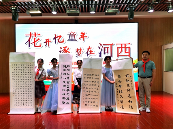 六年级的毕业生代表为学校献礼,展开亲手书写的书法作品,饱含对母校的深情。
