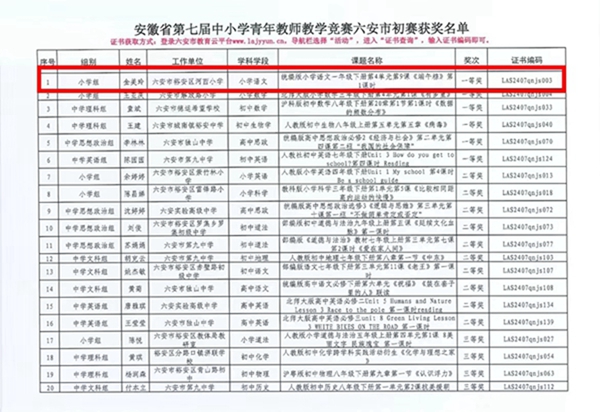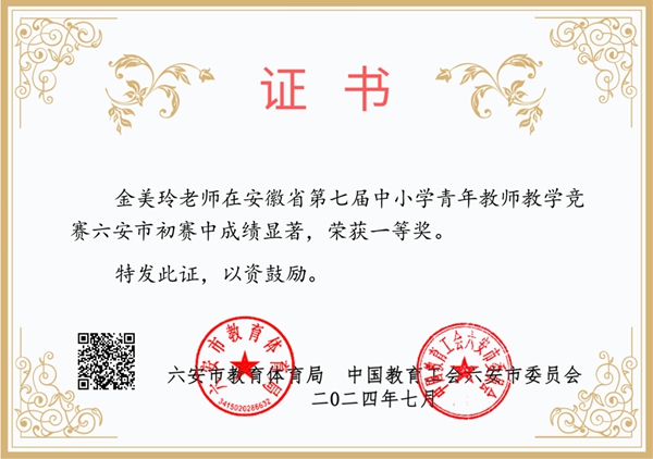 2024年7月7日至9日,由六安市教育体育局、中国教育工会六安市委员会主办的安徽省第七届中小学青年教师教学竞赛六安市初赛在六安市皋城中学光明路校区举行,来自全市的各学科优秀青年教师在各组别中展开激烈角逐,億彩网教育集团河西小学金美玲老师荣获小学组一等奖。