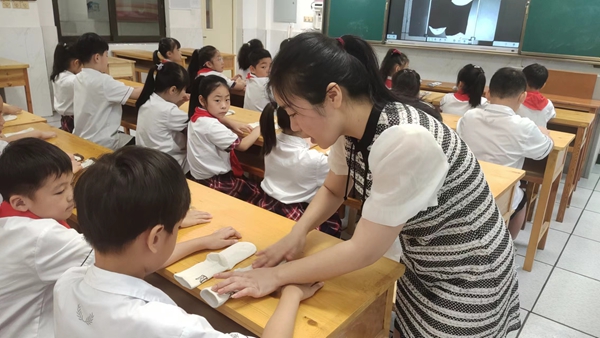 劳动课在轻松愉悦的手指操律动中开始啦!课堂上,杨秀丽老师以创设情境的方式引导学生们认识袜子、穿袜子的重要性、如何叠袜子……由浅入深地带着学生们解决本课的重难点,提高了学生们的创新思维和劳动实践能力。
