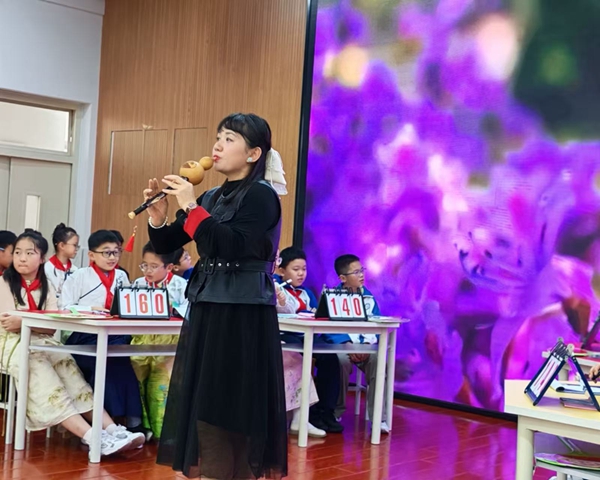 因部分班级同分,竞赛进入“赏秋月纪念抗战”附加阶段。这一融合抗战历史知识的抢答环节中,选手们迅速举牌争夺答题权,在紧张角逐中重温峥嵘岁月,彰显了家国情怀。最后,邓冠男老师陶笛独奏《成都》穿插其间,为激烈的比拼增添了一抹温情。