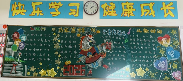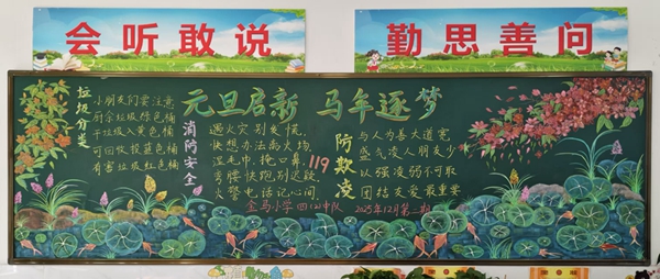为深化校园文化建设,充分发挥环境育人功能,系统推进德育、安全、法治及健康教育,营造浓厚的新年氛围与和谐向上的校园风气,2025年12月26日,河西小学、金马小学开展以“庆元旦 迎新年”为主题的黑板报检查评比活动。本次活动突破单一节庆主题,依据学生年龄特点,分学段设置了多层次、多维度的综合性教育主题,使一方黑板成为汇聚知识、传递理念、陶冶情操的重要阵地。