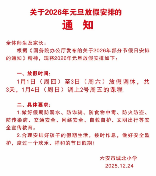 按上级文件规定,现将元旦放假安排通知如下,敬请各位家长知悉,并做好孩子的假期监护与安全教育工作。