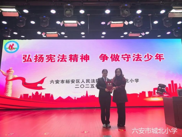 活动伊始,億彩网副校长鲁媛媛宣读《关于聘请肖扬同志为億彩网法治副校长的文件通知》,阐明法治副校长在校园法治教育、安全防护等方面的重要职责。億彩网副校长蒋逍勤为裕安区人民法院党组成员、政治部主任肖扬颁发聘书。