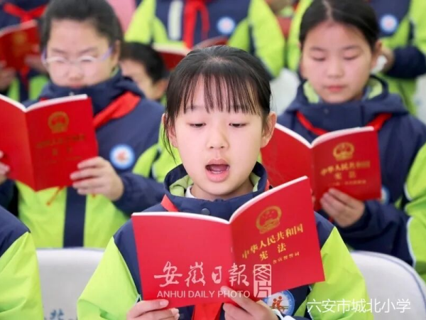 “中华人民共和国公民在法律面前一律平等……”裕安区人民法院刑事审判庭法官卢秉方带领全体队员齐声诵读宪法核心条目。稚嫩而铿锵的声音里,是对宪法条文的铭记,更是对法治精神的敬畏。