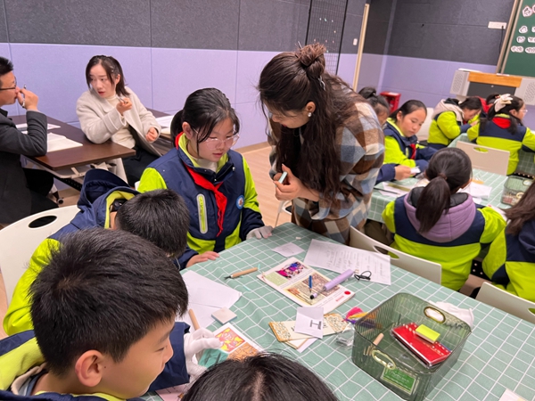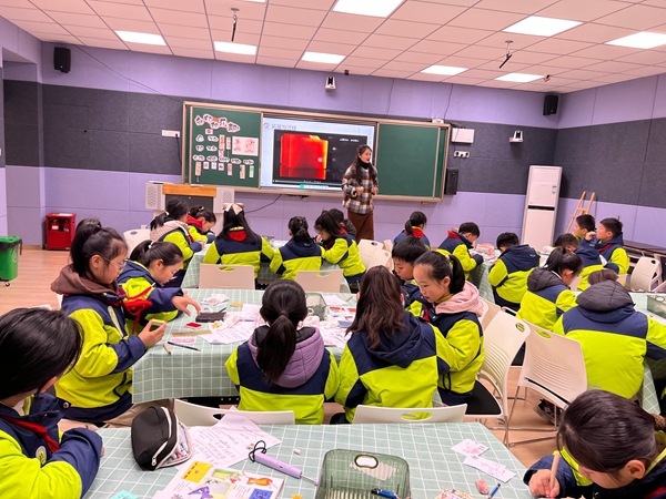 此次献课的是河西小学青年教师钮士兰。她执教的是四年级美术课程《刻印的乐趣》。整个课堂环节设计精妙且富有创意,钮老师巧妙地从春晚非遗视频导入,瞬间抓住学生的注意力,将学生带入充满魅力的传统艺术世界。在教学过程中,钮老师注重实践操作,她在课堂上现场印制阴刻、阳刻作品,让同学们直观感受两种技法在图案、线条表现上的差异,领略刻印艺术魅力。整堂课以学生自主尝试为起点,以解决创作难题为关键点,以作品展示与二次创作为生长点,在不断探索中提升学生的美术创作能力,为听课老师带来了一场艺术的视觉盛宴。