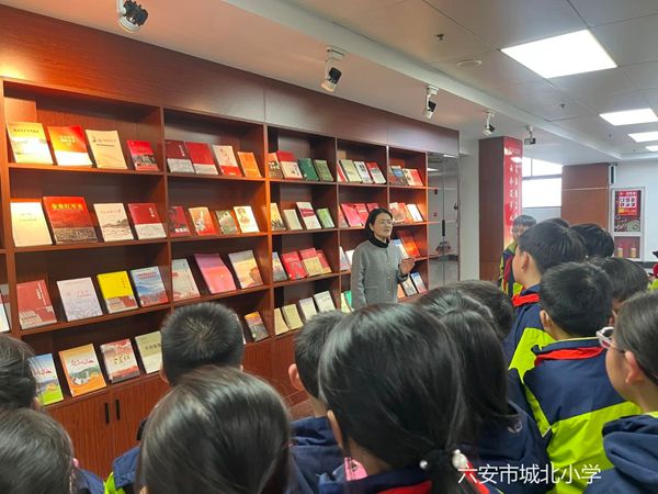 活动伊始,在图书馆讲解员周俊老师的带领下,大家参观了图书馆二楼红色文化书展。队员们轻轻翻阅承载着烽火记忆的书页,《长征史》《红星闪耀》《金寨县革命英雄传》……每一本红色典籍都像一扇时光之窗;当春风掀起《皖西英烈谱》的扉页,漫山映山红便从文字里灼灼盛放,那些被油灯熏染过的誓言、被鲜血洇透的家书,此刻化作星河,坠入孩子们的脑海中,生长出新的年轮。