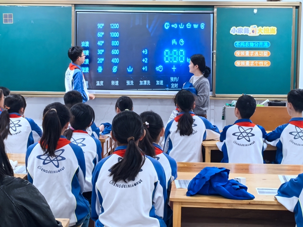 谈婉玉老师授课《小家务 大担当――学习使用洗衣机》。课堂上,谈老师以“换季大清洗”为主线,引导学生联系生活经验,小结洗衣机的基本使用方法;以“分类洗涤”为切入点,学会对不同衣物选择合适清洗程序;创设“远程操控电器”情境,探索洗衣机的“隐藏”功能;通过观看洗衣机近百年发展史,感受科技赋能生活、劳动创造幸福。