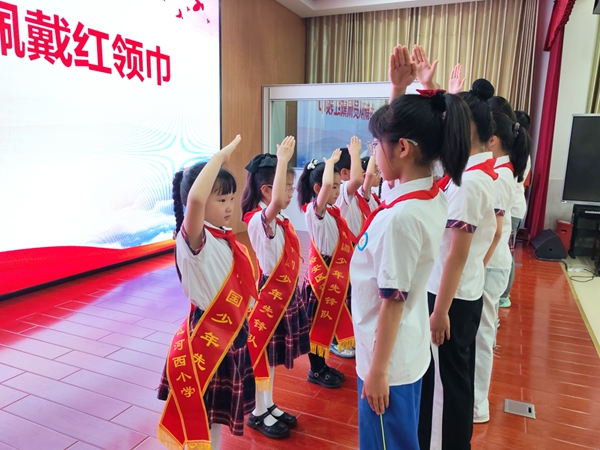 在热烈的掌声中,高年级老队员手捧红领巾,为新队员逐一佩戴。鲜艳的红领巾在胸前飘扬,新老队员互敬队礼,这是少先队精神的传承,更是责任与使命的交接。