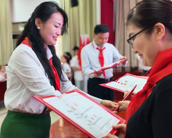 学校领导为新建中队授中队旗,鲜红的队旗迎风招展,象征着新中队的蓬勃朝气。同时,为新任中队辅导员颁发聘书,期望辅导员们带领队员们在少先队组织中茁壮成长。