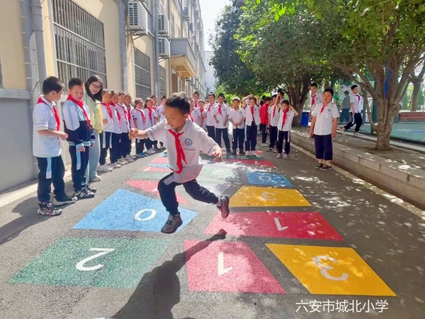 走进校园,色彩斑斓的地面游戏图案映入眼帘,同学们三五成群地聚在游戏区域,“解锁”自己喜欢的游戏。在红色思政主题区域,孩子们通过“重走长征路”的趣味闯关游戏,在跳跃与奔跑中重温革命历史;在安全教育专区,孩子们在“安全飞行棋”的趣味进阶中,重温防溺水、消防、交通等安全知识,提高安全意识。在趣味学科区域,拼音跳跳乐、汉字大冒险、算数跳房子、节气翻转跳等活动,更是将学科知识与游戏深度融合,让孩子们在蹦蹦跳跳间轻松巩固知识、锻炼思维。
