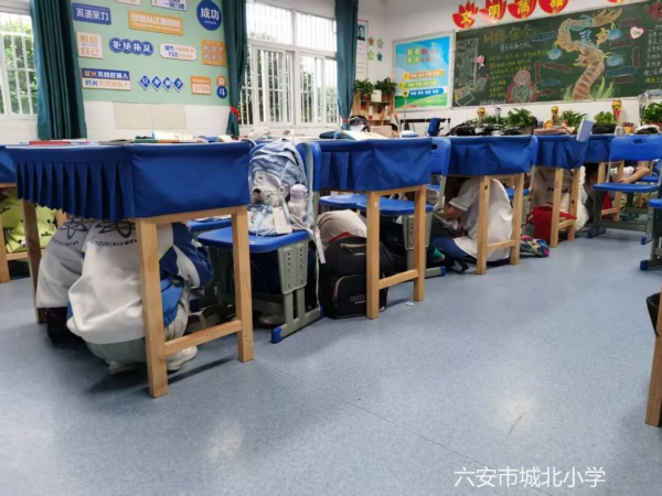 上午9点18分,校园内响起“预先警报”,全体学生迅速反应,双手抱头躲避在课桌下方。