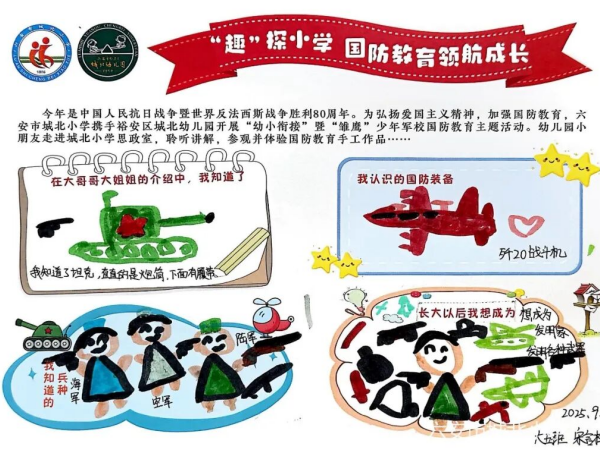 有的中队以学校共建单位中国人民解放军驻裕空军部队为生动教材,邀请中队“空军娃”讲述军营故事,在生动的讲述中感悟军人的责任与担当;有的中队举办了“国防知识知多少”知识竞答,队员们踊跃参与,在激烈的比拼中巩固国防知识;还有的中队以16次国庆阅兵为线索,通过观看视频片段,回顾从开国大典到新时代的阅兵盛况,感受祖国国防力量的跨越式发展。