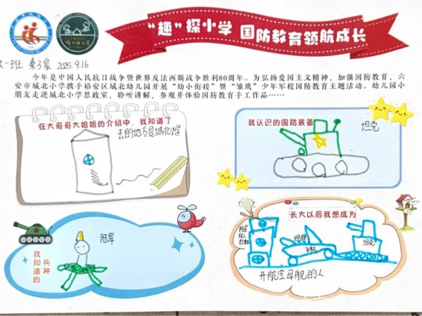回到幼儿园后,在老师们的引导下,小朋友们你一言我一语地讨论着自己的发现,分享自己的收获,并用画笔记录下这场国防教育之旅的珍贵记忆。