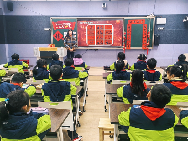 课堂上,张老师紧扣第一课时教学目标,以“让同学们了解中国年的习俗,并认同中华民族的传统文化”为主线,精心设计教学环节。课堂伊始,她手持红彤彤的“”福”字导入课题,瞬间点燃同学们的热情;随后组织热闹的“击鼓传花”游戏,让拿到花的同学们分享自家过年的趣事――从全国通行的贴春联、放鞭炮等年俗,到六安本地的炸圆子、打年糕、蒸腊肉特色习俗,活动还连线结对共建的新疆皮山县固玛镇第一小学,听维吾尔族小伙伴分享当地春节风情。最后,张老师带领孩子们放眼55个少数民族,领略蒙古族那达慕、藏族雪顿节、彝族火把节等特色节日文化,让大家在看、说、玩、互动中,真切感受中华民族年俗文化的多样性与包容性。