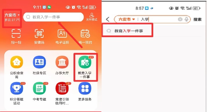 第二步:登录“皖事通”选择地市为“六安市”,在首页找到点击“教育入学一件事”或搜索“入学一件事”,进入服务页面。