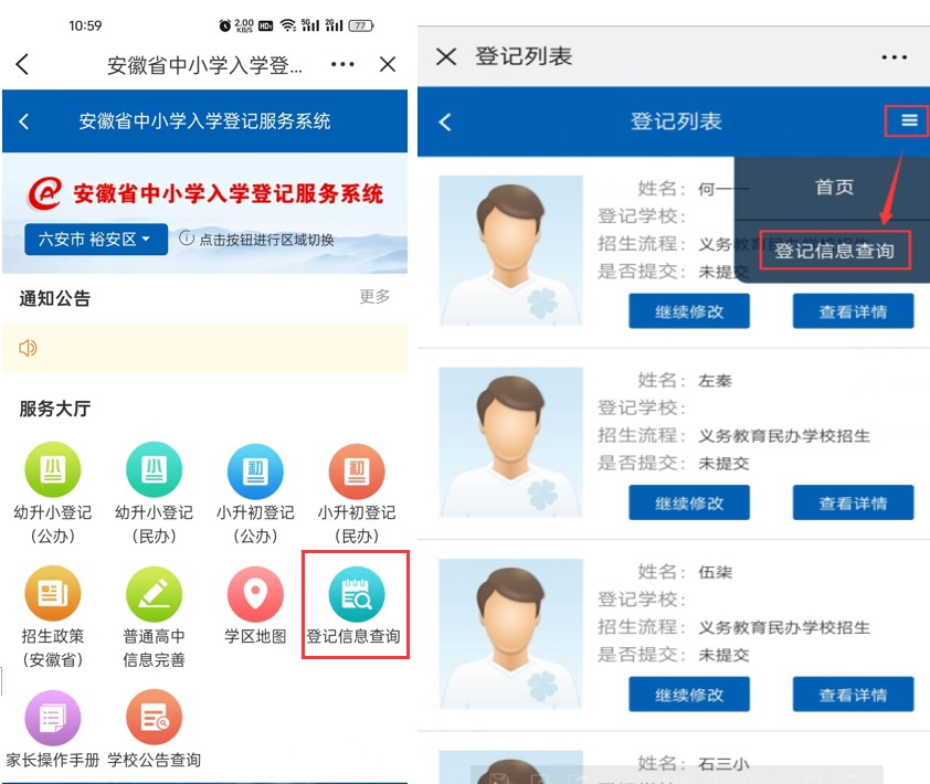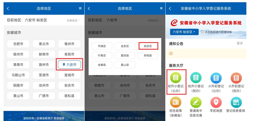 第三步:进入“安徽省中小学入学登记服务系统”,选择“六安市”“裕安区”,点击选择“幼升小登记(公办)”。