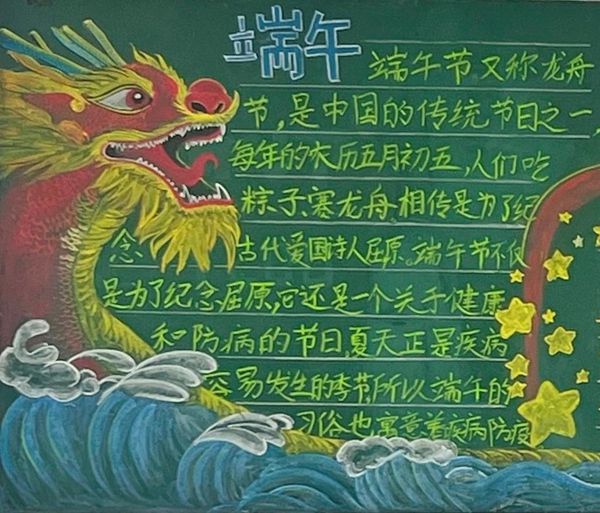 同时,学校还组织队员参与到端午节黑板报的创作中。从端午节的由来、习俗到气势磅礴的龙舟、香气四溢的粽子、翠绿的粽叶等精美的手绘图案;各班的黑板报主题鲜明,内容丰富,生动展现了端午节的文化底蕴。
