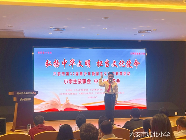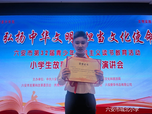 为大力弘扬中华优秀传统文化,激发少年儿童的文化自信与使命担当,引导其树立远大理想,6月4日,六安市第32届青少年爱国主义读书教育活动之小学生故事会、中学生演讲会比赛在六安市图书馆圆满落下帷幕。我校叶劲松同学凭借生动的讲述和扎实的功底,从全市众多参赛选手中脱颖而出,以男生组第一名的成绩荣获小学组一等奖,并将代表六安市参加省级比赛。