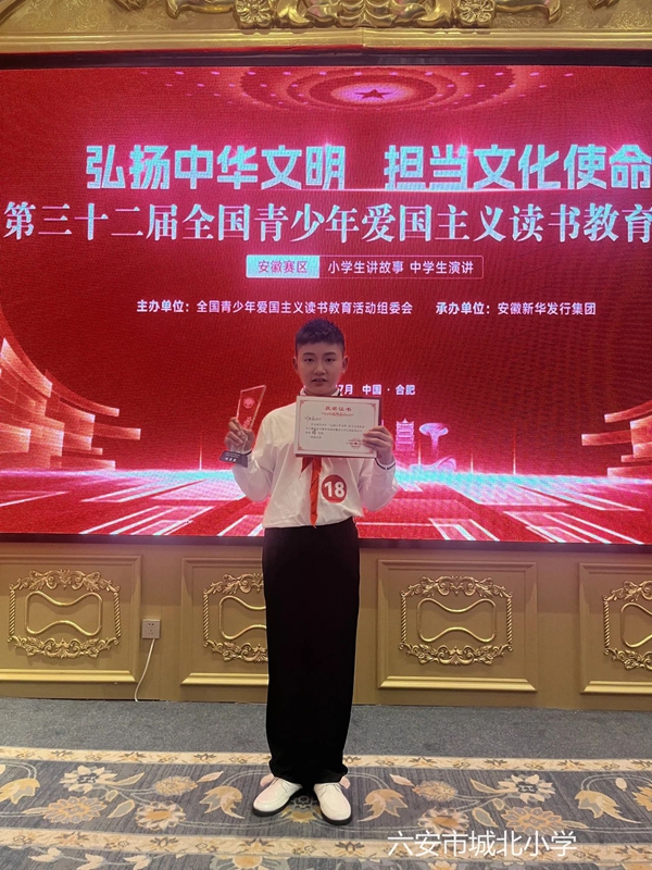 此次成绩的取得是我校坚持“五育并举”、重视素质教育的生动体现。一直以来,学校高度重视爱国主义读书教育活动,通过开展主题故事会、主题征文、实地研学等活动,引导学生在阅读中厚植家国情怀,在实践中提升综合素养。学校连续多年代表六安市参加省级爱国主义读书教育活动,荣获一二等奖及优秀组织奖。未来,学校将继续深化爱国主义教育,为培养爱党爱国、勤奋好学、全面发展的新时代好少年不懈努力。(巴丹丹)