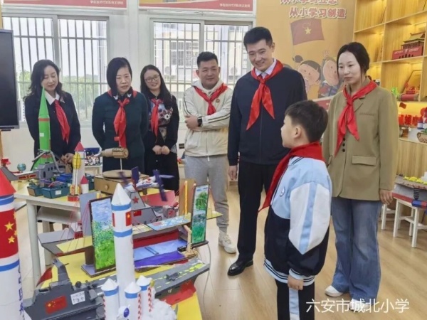 仪式结束后,与会领导走进学校思政室,参观少先队员国防教育手工作品展。展区内,歼-20战斗机、坦克、国产航母、长征火箭等由少先队员亲手打造的“大国重器”整齐列阵,吸引了领导们的驻足观赏与连连称赞。